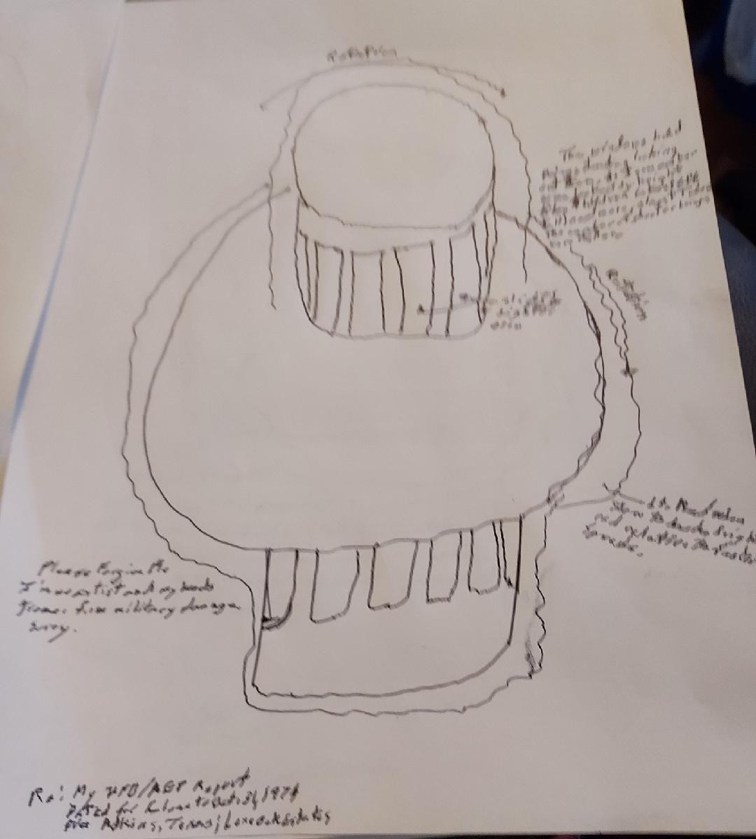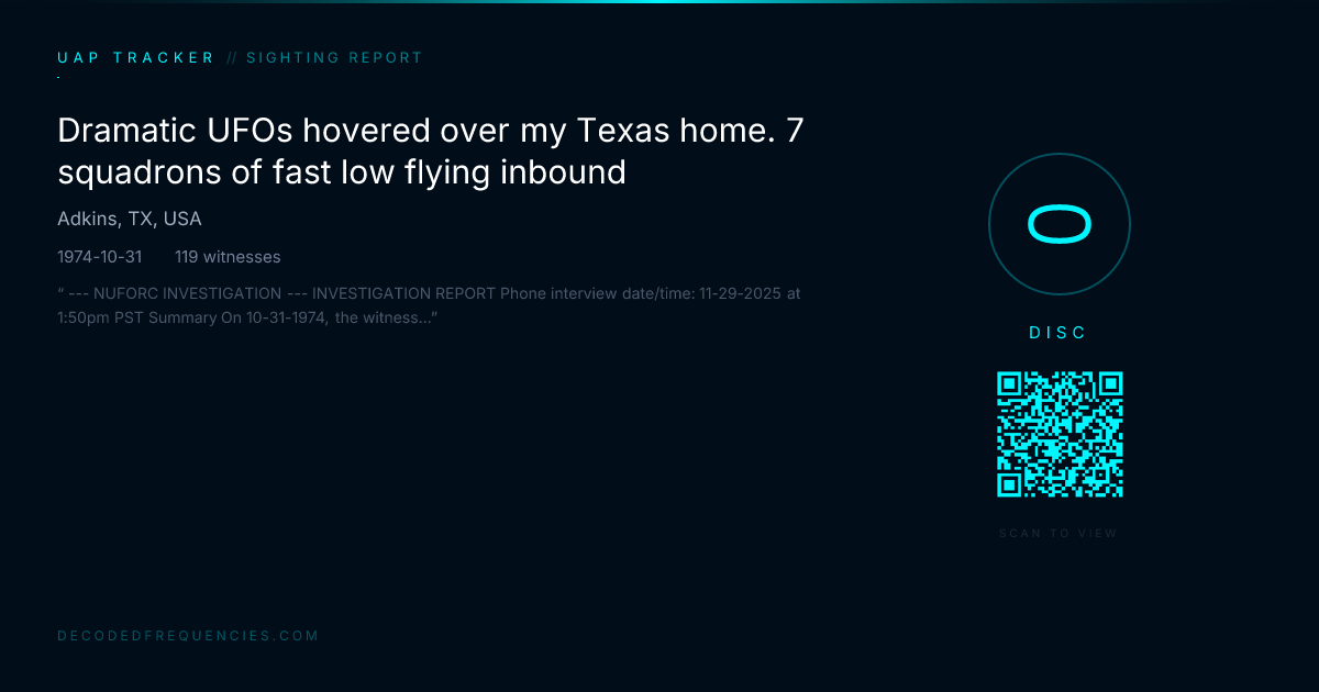 --- NUFORC INVESTIGATION --- INVESTIGATION REPORT Phone interview date/time: 11-29-2025 at 1:50pm PST Summary On 10-31-1974, the witness, identified as T, observed approximately 50 to 60 silent circular orange obs over his property and over the rest of the city of Adkins, Texas. T served in the U.S. Navy for approximately 7 years. Statements T stated that on the date/time of the observation, he was approximately 14 to 15 years old. T then stated that the first craft he observed was approximately 20 to 25 feet wide which he compared to the size of his garage that the craft flew over. T stated that the craft was orange in color, spinning clockwise, and was silent. T added that there was no wind and no air displacement while the craft hovered or when it rapidly accelerated out of sight. T stated that he could see windows on the craft as it was hovering 15 to 20 feet above him. T also stated that he saw humanoid looking creatures standing in the windows inside the craft. T stated that the creatures were standing on 2 legs, were really thin, had large eyes, and very long arms. T added that he also observed what he thought were children based on their size standing at the windows as well. T stated that he watched the craft as it started slowly and silently flying towards a nearby forest. T stated that he decided to follow the craft and ran after it. T added that he was able to catch up to the craft, and was running under it as it continued slowly flying towards the forest. T stated that he observed 3 round lights under the craft as he was easily keeping up with it. T then stated that when the craft approached the forest, he stopped and watched it descend into the trees. T stated that he returned to his residence and thought the situation was over. From his residence, he continued to watch the forest. T stated that the craft ascended from the forest about a half-hour later and met with another similar looking craft that had descended from the evening sky. T stated that the first craft changed its color to dark orange then rapidly accelerated straight up and out-of-sight. T stated that for over an hour, he observed approximately 50 to 60 different crafts ascend and descend into the forest and sky, usually in groups of 3 to 7, and on occasion, by themselves. T then stated that all the crafts looked the same, and were still silent. All of a sudden, the crafts that were closest to the forest descended into the forest, while the other crafts shot up into the atmosphere. T stated that his windows started to shake, and he heard a loud roar in the sky coming from behind him. T then stated that he counted 7 different squadrons of U.S. fighter jets as they flew over his house and headed for the forest. T stated that the squadrons would sometimes circle around the forest, while also flying over the area around his neighborhood. T stated that a black sedan drove at a high rate of speed through his neighborhood, and was headed for the forest as well. T stated that the jets flew around for a few minutes, then left. For the next 40 minutes, everything was quiet including all his dogs and chickens that had run off to hide somewhere. T added that the animal's hiding was very unusual. After the 40 minutes was up, a large number of dark orange crafts shot up out of the forest and silently flew away in every direction. T noticed that just about everyone in his surrounding neighborhood was outside watching the show. T stated that he never did see the black sedan leave the area, but it could have without his knowledge since he was more focused on the crafts and fighter jets. T stated that even though this incident happened many years ago, he still remembers it like it happened yesterday. T also stated that after the incident, he had nightmares about UFOs for quite some time. T stated that his sister might have had a UFO encounter when she was younger, so he gave me her phone number to see if she would be interested in talking about it. On 12-1-2025 at 1:30pm PST I spoke to T's sister identified as R. R stated that her possible UFO encounter occurred in Hall Summit, Louisiana when she was approximately 21 years old. R then stated that she was with 2 other friends when the incident occurred. R stated that the year was 1983 and all 3 friends were walking on a familiar country road at night. R stated that as the 3 of them were walking, she noticed that all 3 of them were walking in slow motion. R stated that all 3 of the girls looked at each other with wide eyes as they continued to walk slowly together. R then stated that she remembers being able to see the road and the forest around her, and the only other thing she can remember was how heavy the air felt. R stated that at the time, she had no idea how long the 3 of them were walking slowly, then all of a sudden, they were walking normally. R then stated that if felt to her like the 3 of them were shoved out of whatever they were in. R added that all 3 of them sprinted to the signal light ahead and then walked home. R then stated that when she got home, her brother T was waiting on the porch getting ready to go look for her. R stated that T told her that she was 3 hours late coming home, and he was worried and preparing to go look for her. R stated that she told T what had happened. R stated that she didn't have any side-effects from the experience until about 3 months later when she felt a lump on the back of her neck. R stated that the lump was on the left side. R also stated that both her friends each had a lump on their necks in the same place. R stated that she didn't go see a doctor about the lump, even though it would swell up on occasion. R stated that her 2 friends told her that their lumps also would swell up on occasion. R stated that when she tried to touch the lump, it seemed to move. R stated that after 20 years, the lump finally popped, and something came out and landed on her laundry room floor. R added that whatever it was that came out hit the floor 