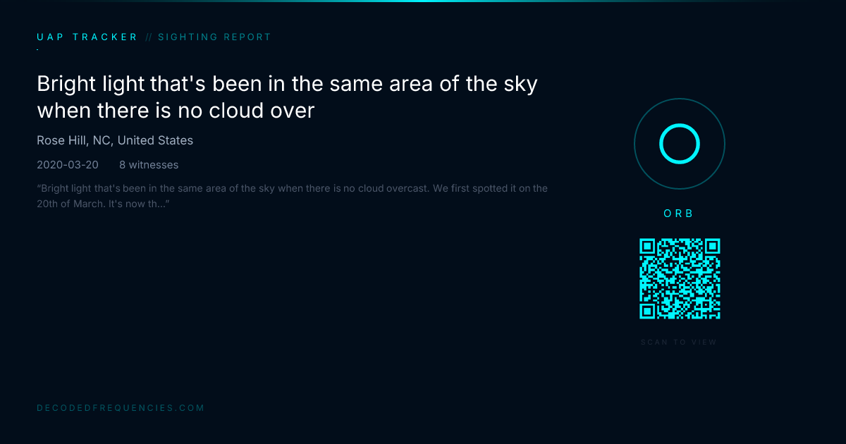 A persistent, stationary light observed on multiple clear nights over three weeks, described as an orb or polygonal shape, exhibiting anomalous persistence and an anecdotal intelligent reaction, though conventional aerial objects remain plausible explanations.